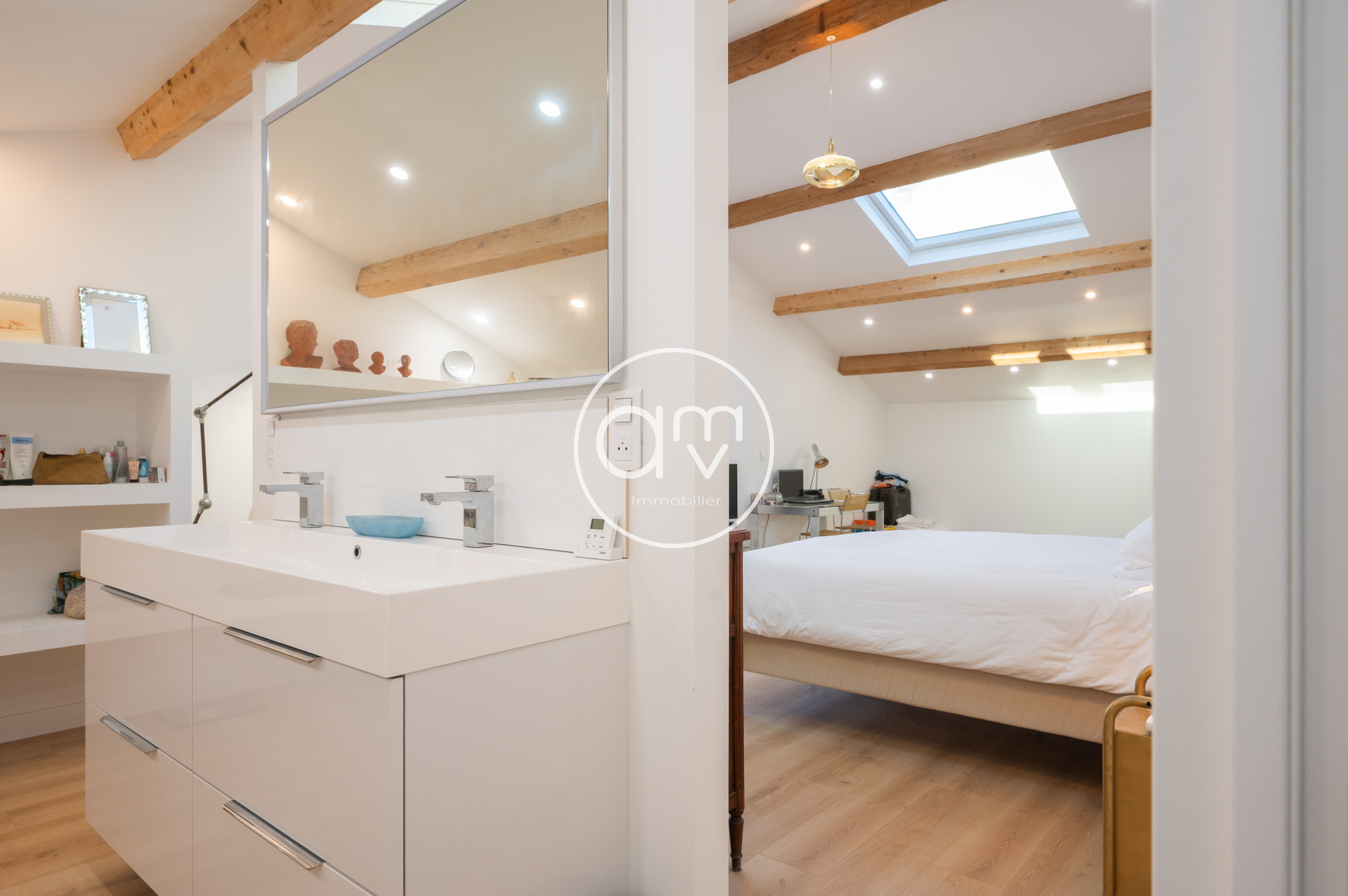 Le dernier niveau est dédié à la suite parentale, traitée comme un volume indépendant sous charpente apparente, avec une hauteur sous faîtage supérieure à 3 mètres. La salle de bains attenante, inspirée de l'hôtellerie haut de gamme reste à découvrir!
